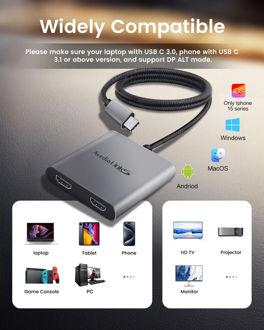 product four avedio links USB-C to Dual HDMI Adapter, Type C to HDMI Splitter for Dual Monitors, 4K@60Hz for 1 Display, 4K@30Hz for 2 Displays, MST (Extend Different Screens) Mode for Windows (Not for Mac OS)